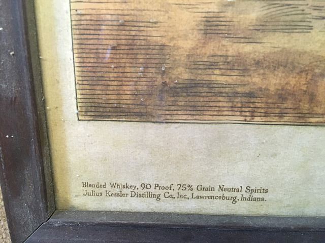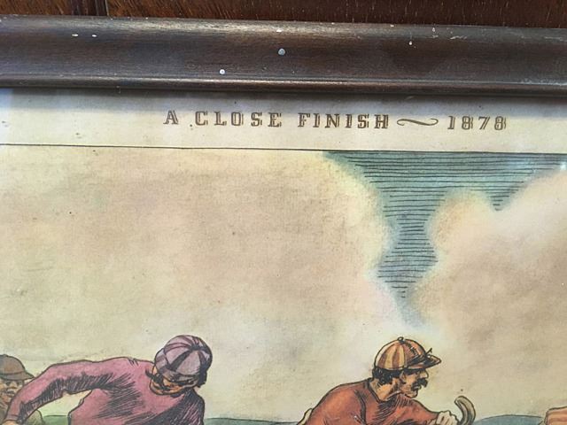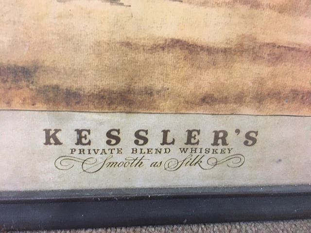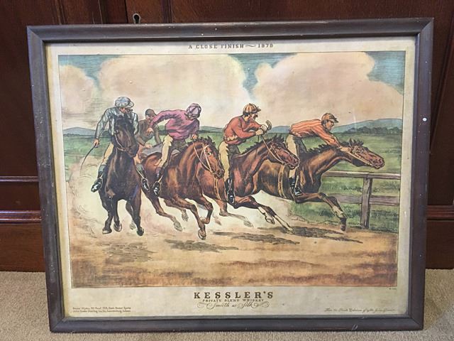 Vintage Kessler's Private Blend Whiskey advertising print, "A Close Finish - 1878", in glass frame.