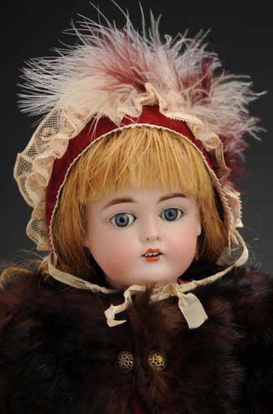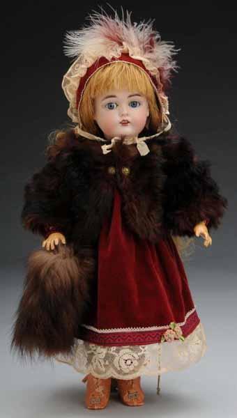 Description Germany, Ca. 1900. Bisque socket head incised 167, sleeping eyes, open mouth with teeth, vintage human hair wig (glued down tight). Jointed composition body with mama/papa pull strings (not working, normal wear and scuffs). Redressed with fur cape and muff, velvet dress and hat, vintage boots. Condition (Very Good). Size 16" T.