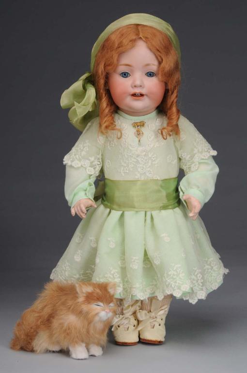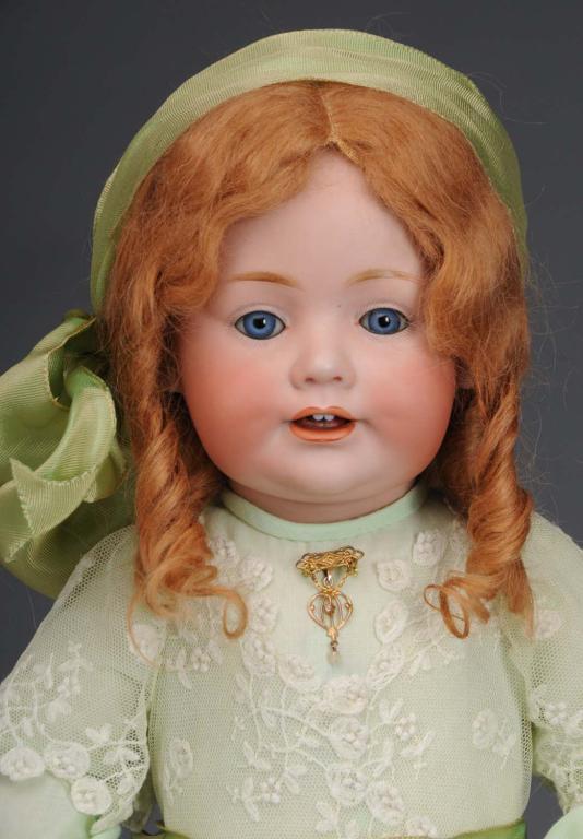 German, circa 1910. Bisque socket head incised "JDK 247". Blue sleeping eyes, dimples, open mouth with tongue and two upper teeth, and replaced mohair wig. Composition toddler body with jointed elbows and wrists, and one piece legs. Redressed in green cotton and lace. Speck between eyes. Condition (Excellent). Size 16" T.