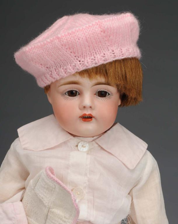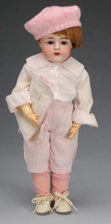German, circa 1890. Bisque socket head incised "161", a rarely found mold. Set brown eyes, multi stroked eyebrows, open mouth with upper teeth, vintage human hair wig, plaster dome, and fully jointed composition body. Wearing vintage cotton suit and shoes. Nose rub and normal wear on body. Condition (Excellent). Size 15" T.