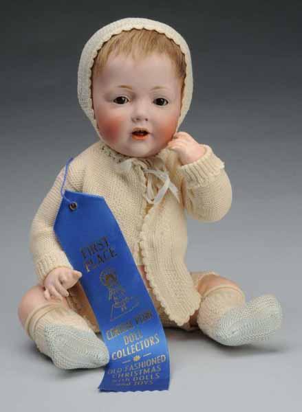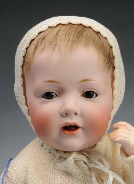 Description Germany, Ca. 1914. Bisque socket head incised "245 J.D.K. Jr.1914 Hilda". Brown sleeping eyes, painted upper and lower eyelashes, fly-away eyebrows , open mouth with 2 upper teeth and tongue, original mohair wig, plaster dome. Composition baby body. Original baby outfit. Condition (Excellent). Size 14" T.