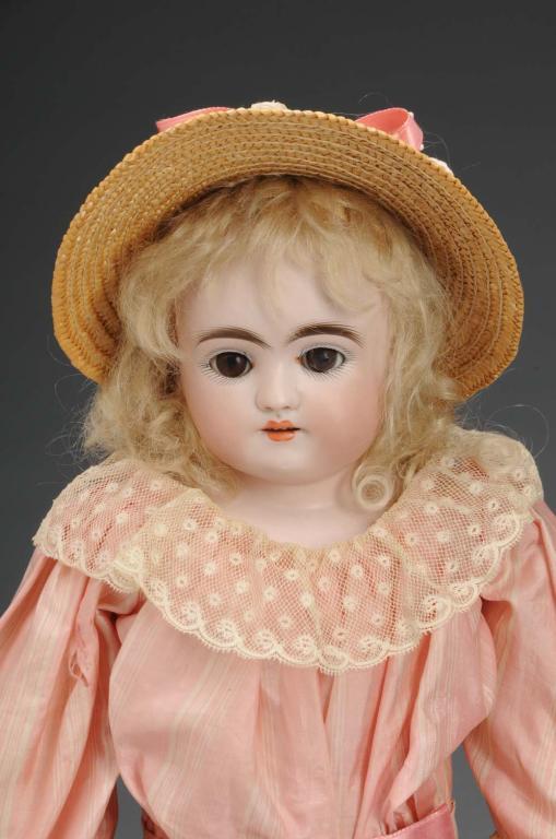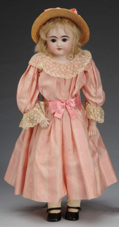 Description Incised in back of head "H1/2". Brown glass sleep eyes, open mouth with teeth, head turned slightly to the right, and gusseted leather body with bisque forearms. Wears an original full blonde mohair wig and has been appropriately redressed in a pink striped silk dress with one pink bow at waist, lace collar, and lace sleeve along with newer patent leather shoes. Condition (Very Good). Size 19" T.