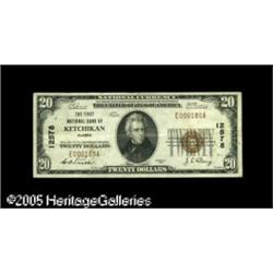 <B>Ketchikan, AK</B></I> - $20 1929 Ty. 1 <B>The First NB</B></I> Ch. # 12578<BR>Although this is hardly a rare note with some thirty examples from here listed in the new Kelly census, it is highly sought after, with the supply of material from Alaska never coming close to catching up with the number of collectors who want notes from here. This piece, which is recorded in the census, is among the highest grade examples known from this bank, which issued small notes only. It's considerably nicer, in fact, than the $20 Type 1 which realized $11,500 in November of 2003, and, in this market, will likely top that sum by a considerable margin. <B>Very Fine,</B></I> with a small and barely visible area on bank stamp on the face. Lot:16811
