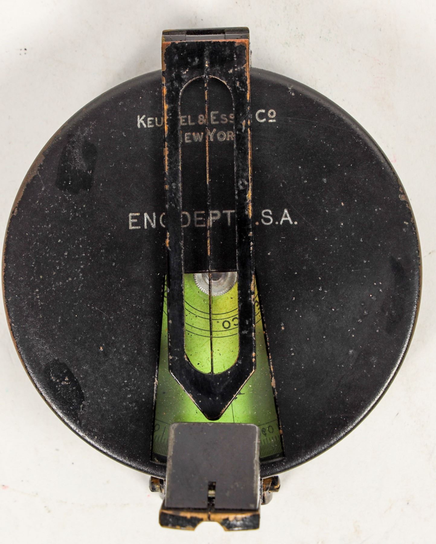 This is a Keuffel & Esser compass marked "Eng. Dept. U.S.A. 1917" on the leather case. The compass is marked "Eng. Dept. U.S.A.". 3 in. diameter. Light pitting on the case. The leather case is in good condition with the stamps of K&E on the front of the case. From the Popovich collection. Please see photo for details.