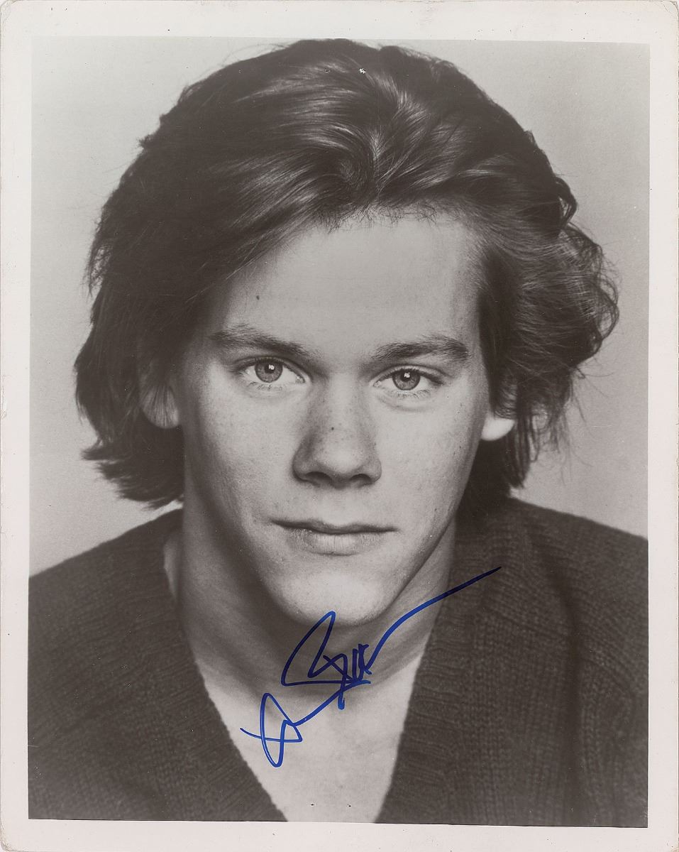 Attractive glossy 8 x 10 publicity portrait of a young Bacon, signed in blue felt tip. Reverse bears an affixed press release for the David Rimmer production Album. In fine condition, with some emulsion irregularity to his nose and chin.