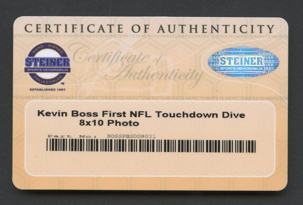 8x10 glossy photo hand-signed in blue felt tip pen by Kevin Boss. Autograph includes a Steiner COA for authenticity purposes.