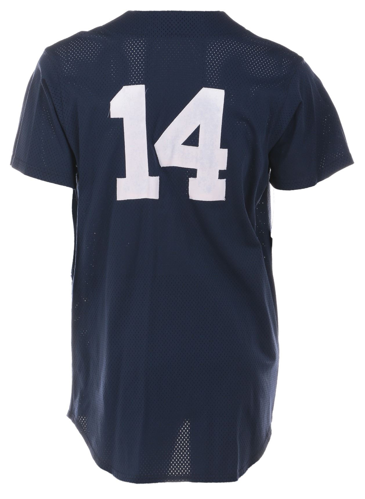 455. Kevin Costner "Billy Chapel" (5) piece baseball ensemble and ball from For the Love of the Game. (Warner Bros., 1999) Original (5) piece ensemble including (1) Starter brand navy blue short sleeve crewneck pullover windbreaker with embroidered "D" on left chest, orange knit shoulder panels/gussets, embroidered "Starter" logo on left arm, and drawstring hem, with 2-snap buttons at neck, (1) Majestic brand navy blue mesh jersey with satin "D" applique patch on left chest, and "14" on back, retaining external Majestic bias label handwritten, "1999" in black ink, (1) Champion brand light gray short sleeve crewneck tee with distressed dark gray screen print "Property of [D' logo] Tigers Baseball" on the front, (1) New Era brand navy blue and orange wool baseball cap with embroidered "D" on front (not screen used), and (1) production used baseball. Exhibiting production wear. Hat from production but not used. In very good to very fine condition. $400 - $600