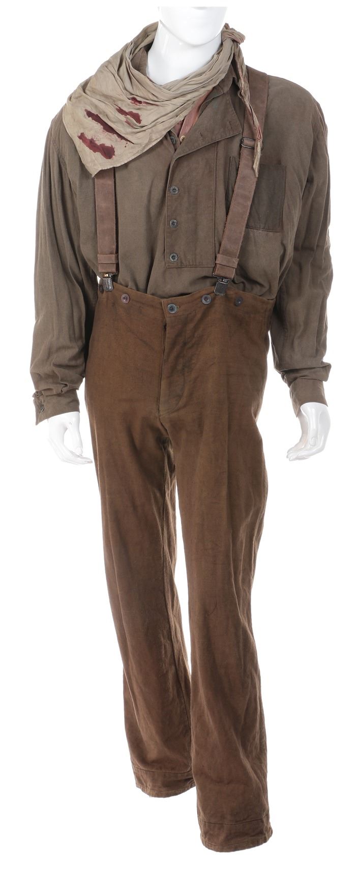 457. Kevin Costner Charley Waite" ensemble and accessories from Open Range. (Touchstone, 2003) Original (6) costume pieces including (1) long sleeve rough spun olive green collared shirt with 1-chest pouch pocket and button-up panel, (1) faded orange collarless long sleeve cotton tee with 3-buttons at neck, (1) pair brown canvas trousers with 1-pair suspenders and button front closure, (4) bandanas, 3-orange and black paisley, 1-gray and soiled with studio applied SFX blood, including 6-costumer's Polaroid pictures of cowboy hats. Exhibiting production wear and studio soiling. In very good to fine condition. $800 - $1,200