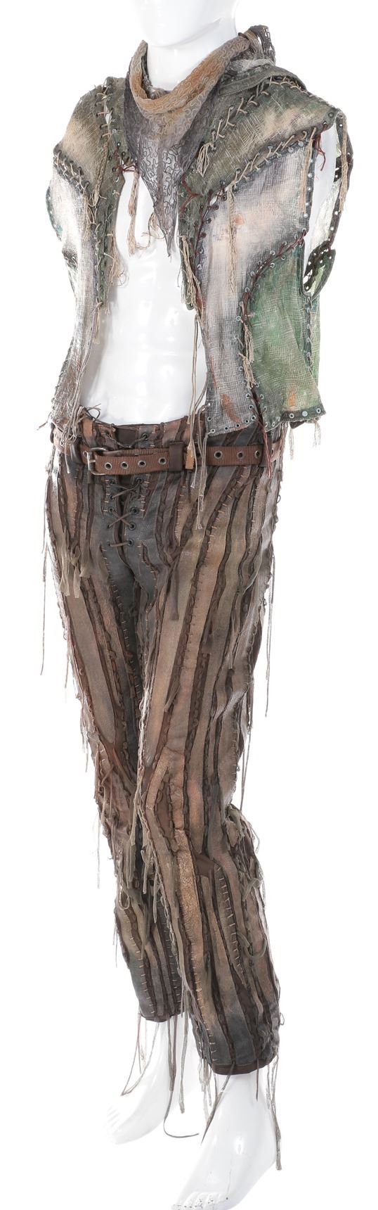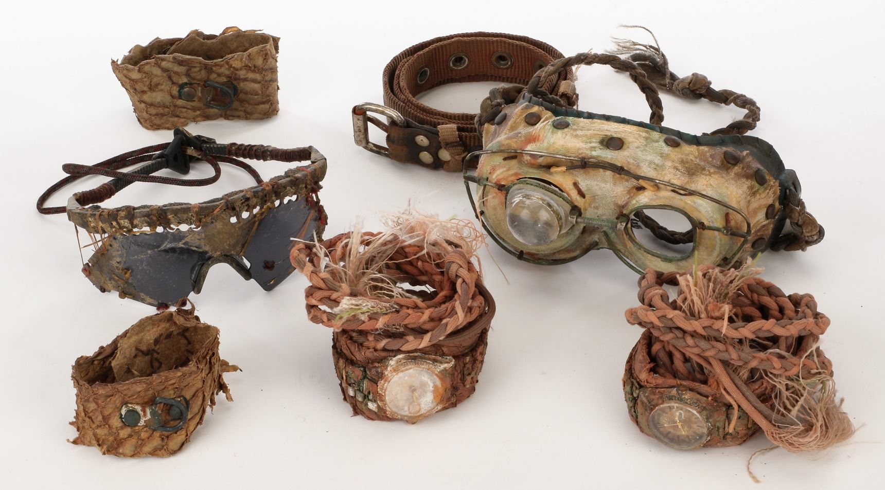 444. Kevin Costner "Mariner" ensemble from Waterworld. (Universal, 1995) Original (9) piece dystopian oceanic signature ensemble including (1) fabric "fish skin" hooded vest with crude stitching, scant fringe and lace up front closure, (1) pair of leather and brown spandex pants with lace up front closure, rough leather panels and stitchery, and 2-included brown web belts with metal grommets and buckles, (1) pair of barnacled and weathered sunglasses, (1) pair leather and metal frame appraisal goggles with plastic magnifying orb, (2) studio distressed woven wrist bands with integral corroded watches and long trailing woven straps, (1) pair "fish skin" wristlets with metal snap closure, (1) embroidered mesh neck scarf, (1) beaded necklace with resin "computer chip" pendant, and including accessories loose shell ornaments and assorted bits of trim. All pieces are expertly studio distressed and weathered to perfection. In production used fine condition. $1,000 - $1,500