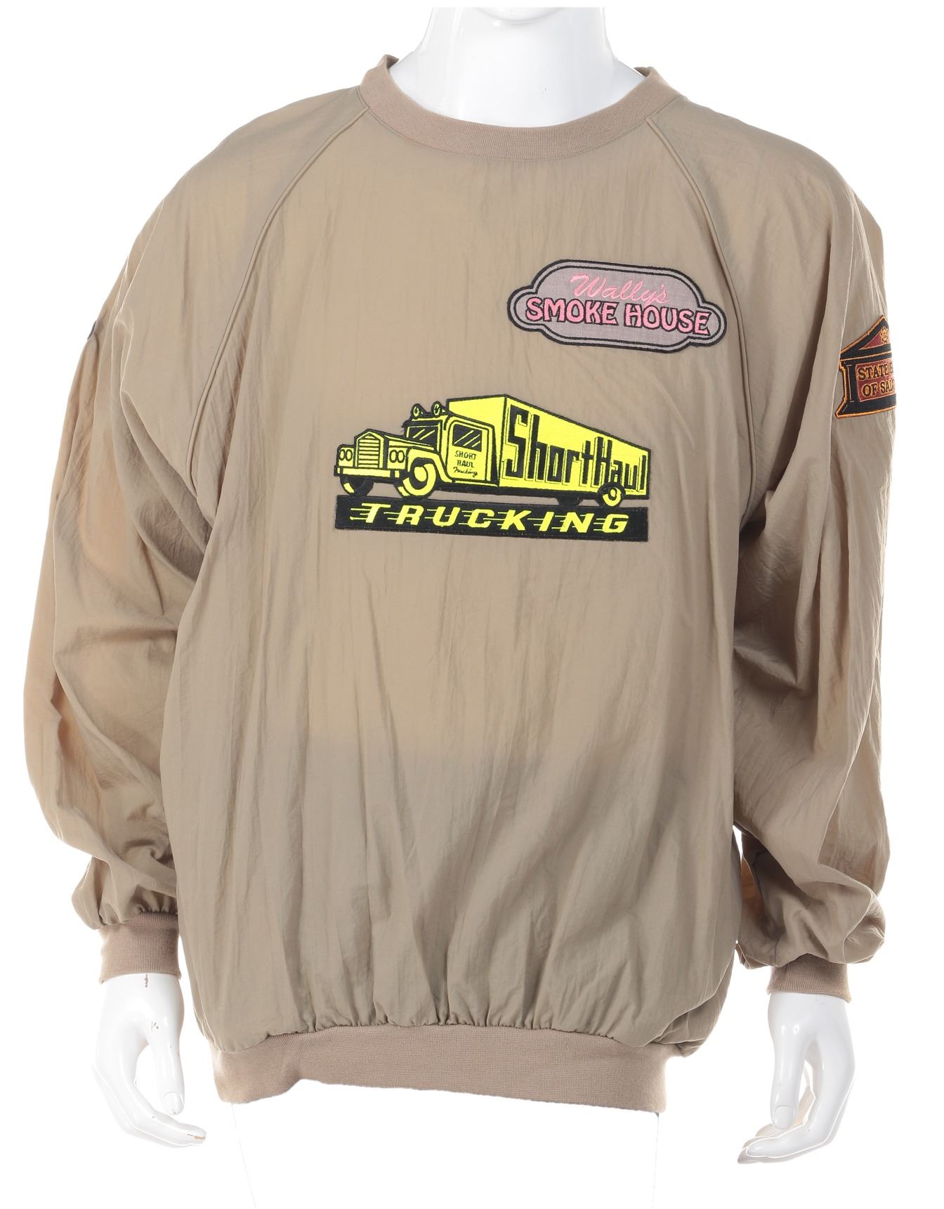 446. Kevin Costner "Roy McAvoy" (2) pullover sponsor windbreakers from Tin Cup. (Warner Bros., 1996) Original Slazenger brand clay colored long sleeve pullover with knit wide-neck collar, cuffs and hem, with 5-embroidered patches. Exhibiting light production wear. In very good to fine condition. $300 - $500
