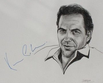 Black and white pencil drawing of Kevin Costner by Joseph Namsinh, signed by the actor in blue felt pen. Signed at the premier of Waterworld in 1995. Measures 16 x 20.