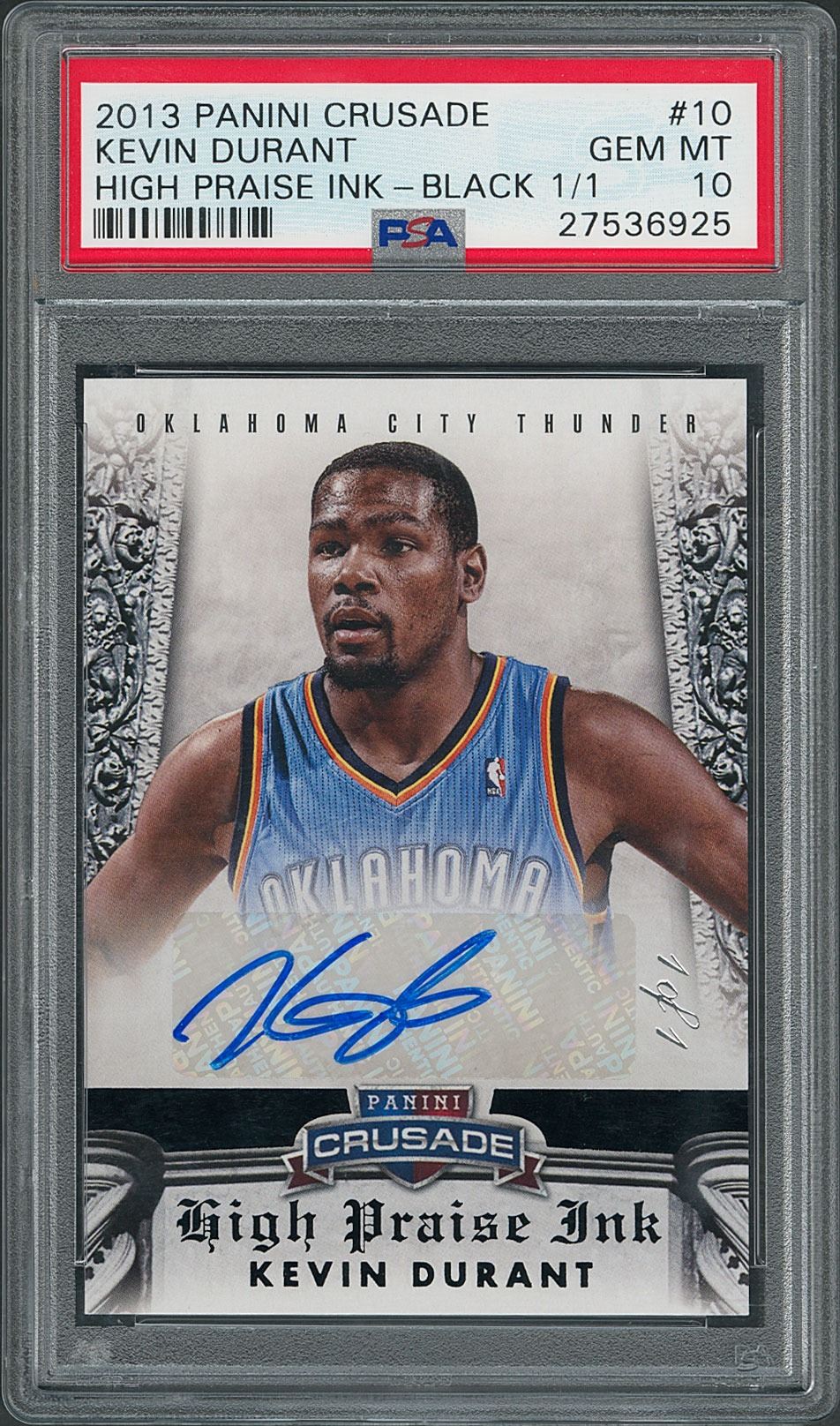Graded by PSA GEM MINT 10. 2013 Panini Crusade High Praise Ink #10 Kevin Durant basketball card, numbered 1/1, signed on the affixed hologram label in blue felt tip by the Oklahoma Thunder superstar. In gem mint condition. A choice, one-of-a-kind specimen of this future Hall of Famer.