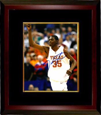 For the 2006–07 college season, Durant earned a number of season-end awards and honors, including being named the Naismith College Player of the Year, becoming the first ever freshman to win the award. On April 11, he officially declared for the 2007 NBA draft. His jersey was later retired by the Longhorns. Kevin Dyrant has hand signed this Texas Longhorns 8x10 Photo. Certificate of Authenticity from Athlon Sports. Custom Black Mat and Premium Mahogany Color Framed as shown.