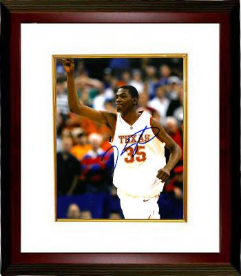 For the 2006–07 college season, Durant earned a number of season-end awards and honors, including being named the Naismith College Player of the Year, becoming the first ever freshman to win the award. On April 11, he officially declared for the 2007 NBA draft. His jersey was later retired by the Longhorns. Kevin Dyrant has hand signed this Texas Longhorns 8x10 Photo. Certificate of Authenticity from Athlon Sports. Custom White Mat and Premium Mahogany Color Framed as shown.