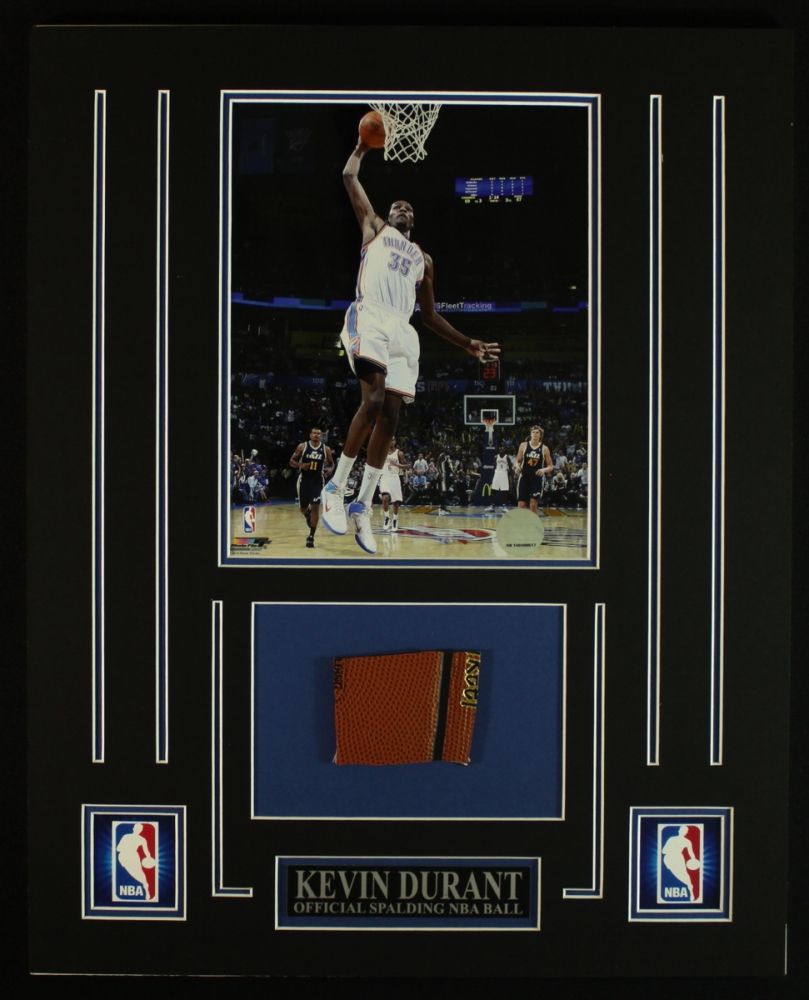 Piece measures 16x20 in size and is highlighted by a piece of basketball. The piece of basketball has been custom matted with an 8x10 photo.