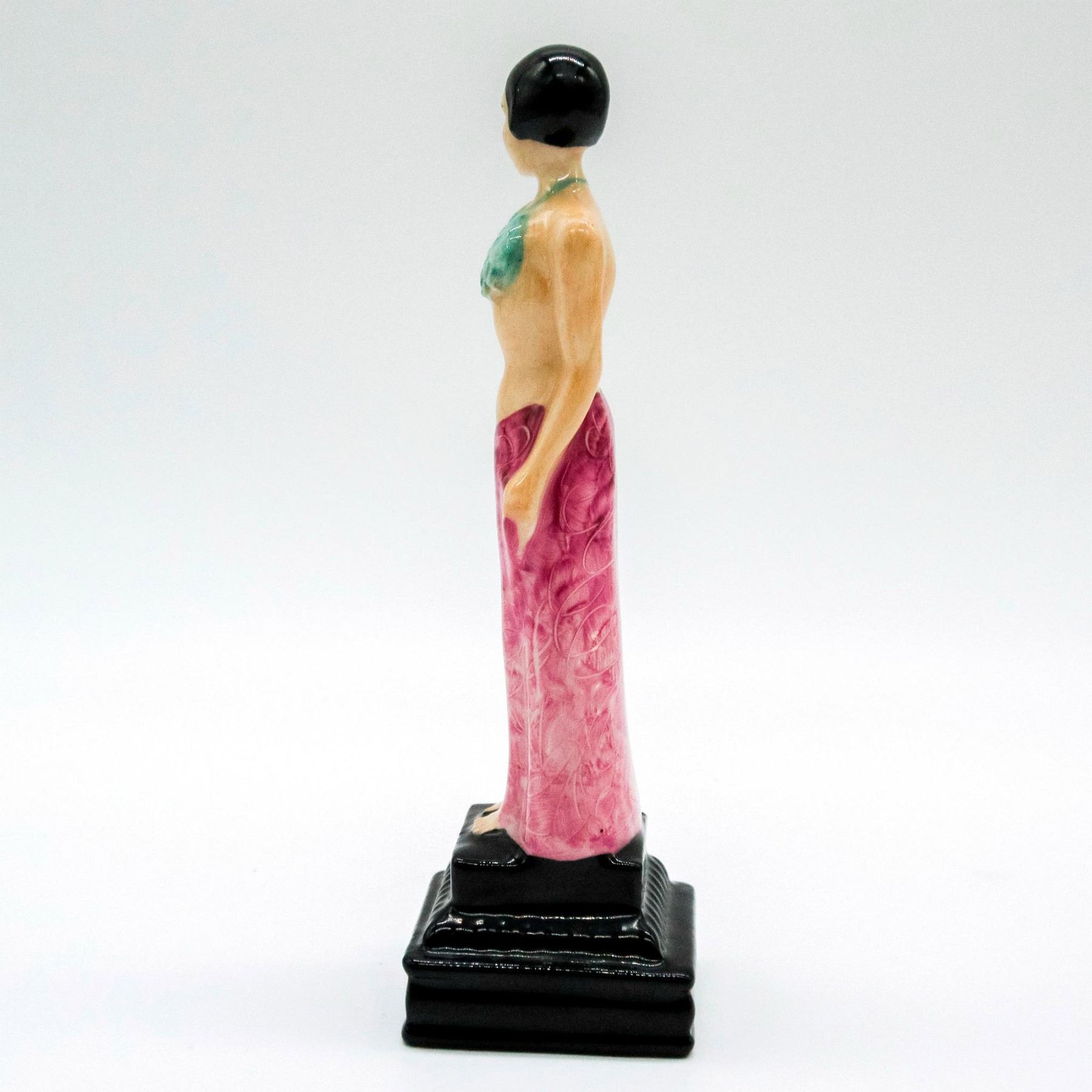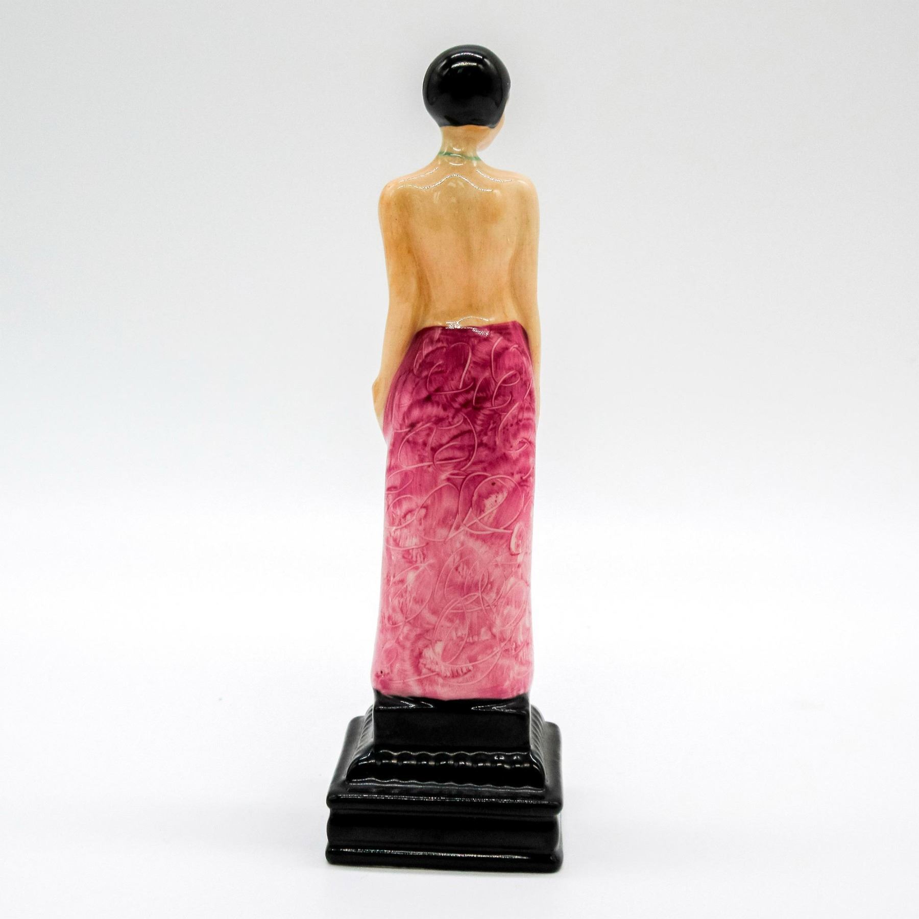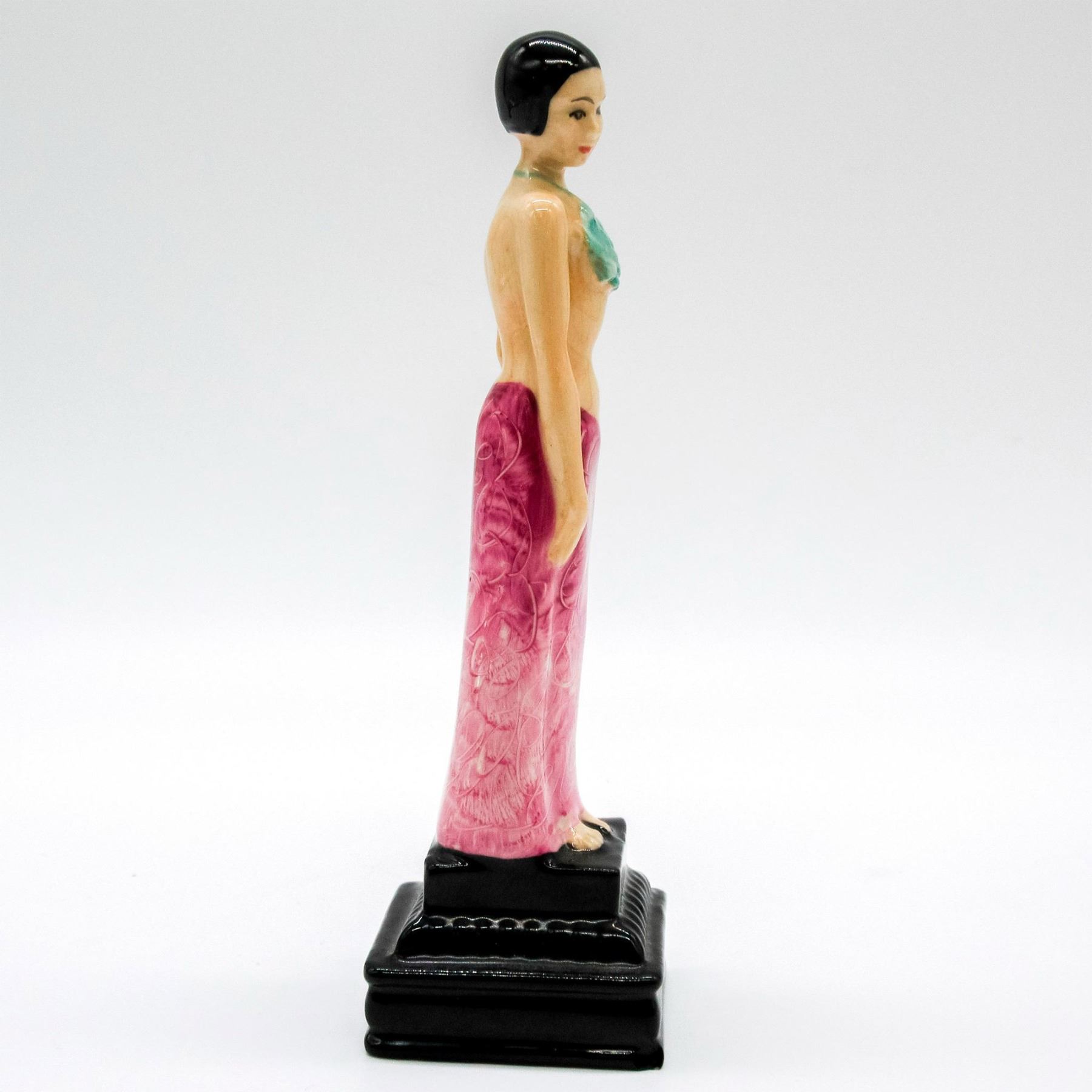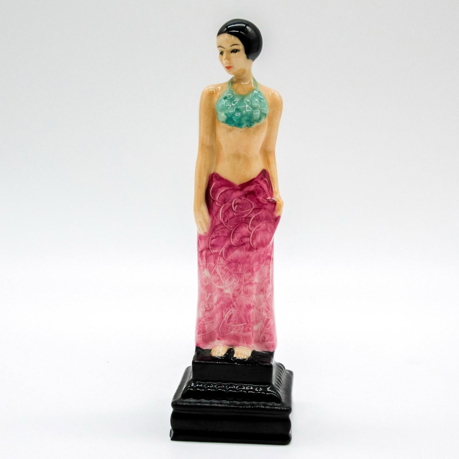 Art Deco figure of a woman with a teal top and mauve skirt. Kevin Francis backstamp. #KevinFrancis #Mini #Ceramic #ArtDeco #Figurine #Abagail