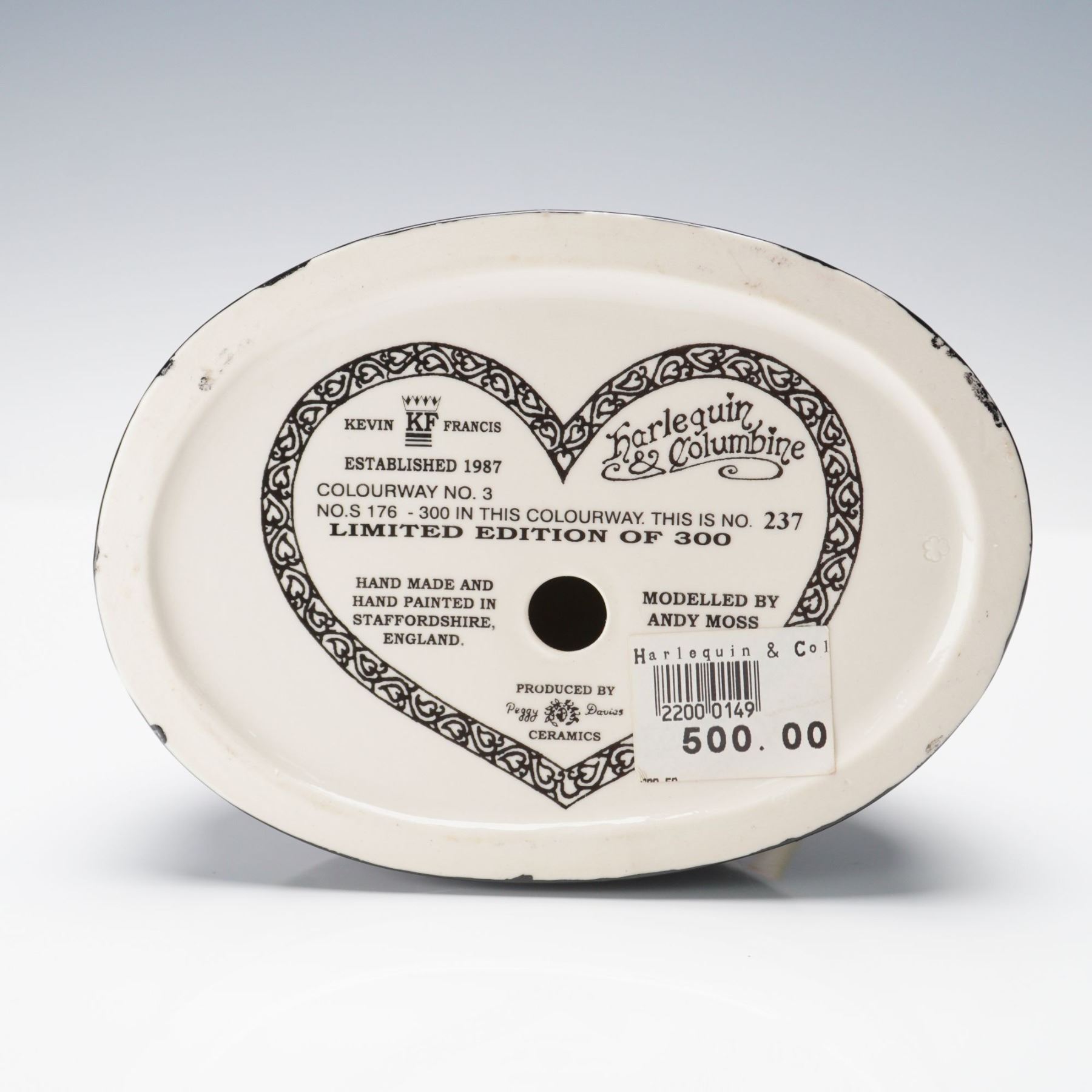 Kevin Francis limited edition figurine, Harlequin and Columbine, modelled by Andy Moss, number 237 of 300 in Colourway No. 3. Hand made and hand painted in Staffordshire, England, and produced by Peggy Davies Ceramics. The piece depicts the masked Harlequin supporting Columbine in a dynamic pose, finished in vibrant tones of blue, lilac, and gold, and mounted on a black marble-effect base.