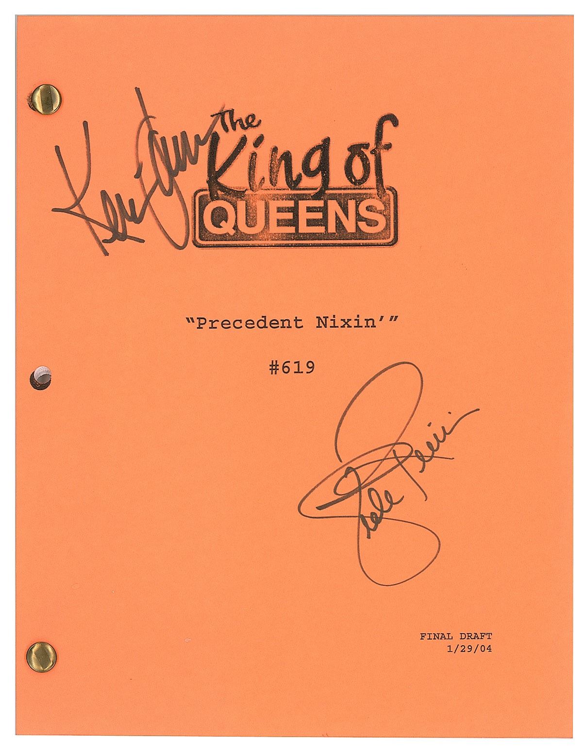 Brad-bound final draft script for The King of Queens episode 'Precedent Nixin',' season six, episode 19, 58 pages, 8.5 x 11, dated January 29, 2004, signed on the front cover in black felt tip by Kevin James and Leah Remini. In fine condition.