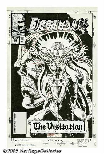 <B>Kevin Kobasic and Greg Adams - Deathlok #28 Cover Original Art (Marvel, 1992).</B></I> The Infinity Crusade dealt with the battle against Warlock's repressed feminine, "good" side, the Goddess, who started a religious crusade with the purpose of destroying the universe. She enlists several noble and spiritual heroes to her cause, leaving it up to the hard cases to save the universe -- meaning they have to fight teammates and friends in the Goddess' army. In this issue of <B>Deathlok</B></I> #28, the Goddess attempts to recruit Deathlok, in "The Visitation". The art has an image area of 10" x 15" and is in Excellent condition. Signed by Greg Adams.