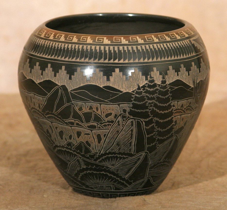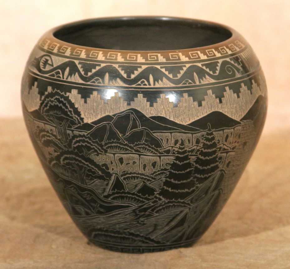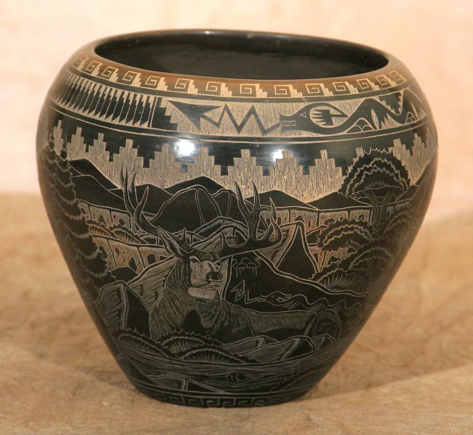 Kevin Naranjo Jar. 4 ¾" x 5 ½" sgraffito blackware jar depicting deer in southwest landscape. Arroyo dragon & feathers around the neck. Signed Kevin Naranjo & Tricia Pena. Rare to find one this large!. (est. $2,500-3,500). CONDITION REPORTS: www.auctioninsantafe.com/docs/cr2012.pdf