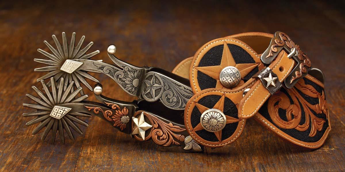 Fully mounted in silver and copper, Kevin’s Lone Star spurs have overlaid, floral patterns intertwined around a 5 pt silver Texas Star on the heelband with the mirrored pattern engraved in the steel on off-side. 2 1/2", 20 pt rowels, silver engraved flower swinging buttons attached to Casey Jordan maker-marked 2-piece floral & Texas Star carved straps are affixed with Peebler’s matching buckle and keeper. Born in Denver in 1963, the Colorado native has been making bits and spurs since 1995 when fellow maker Mark Liston helped him build his first pair. Kevin’s patterns frequently utilize a distinctive design concept with one side mounted with silver, copper and/or brass overlay and the off-side featuring an identical pattern engraved painstakingly into the steel. Kevin and his wife Julie have two children and live in Delta, Colorado