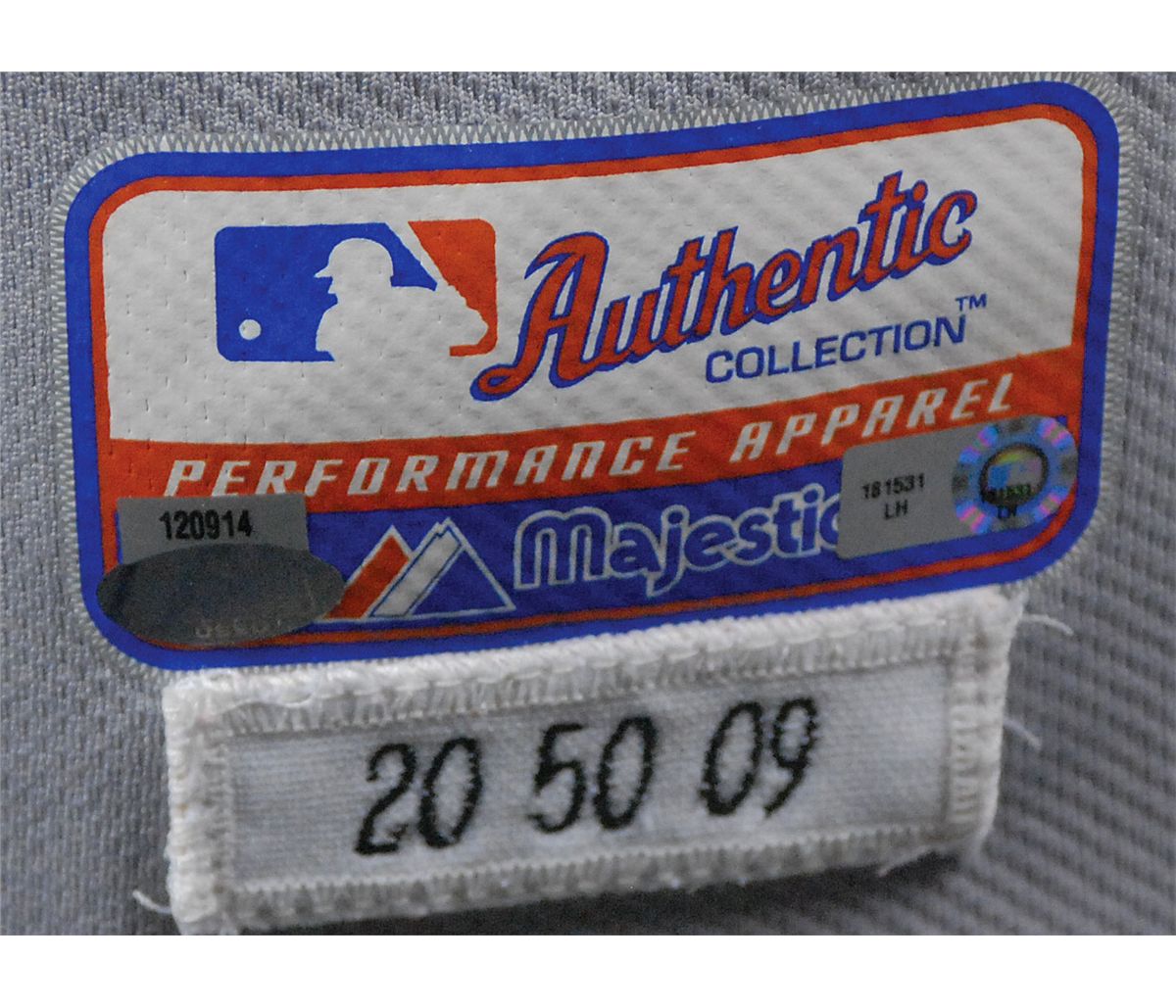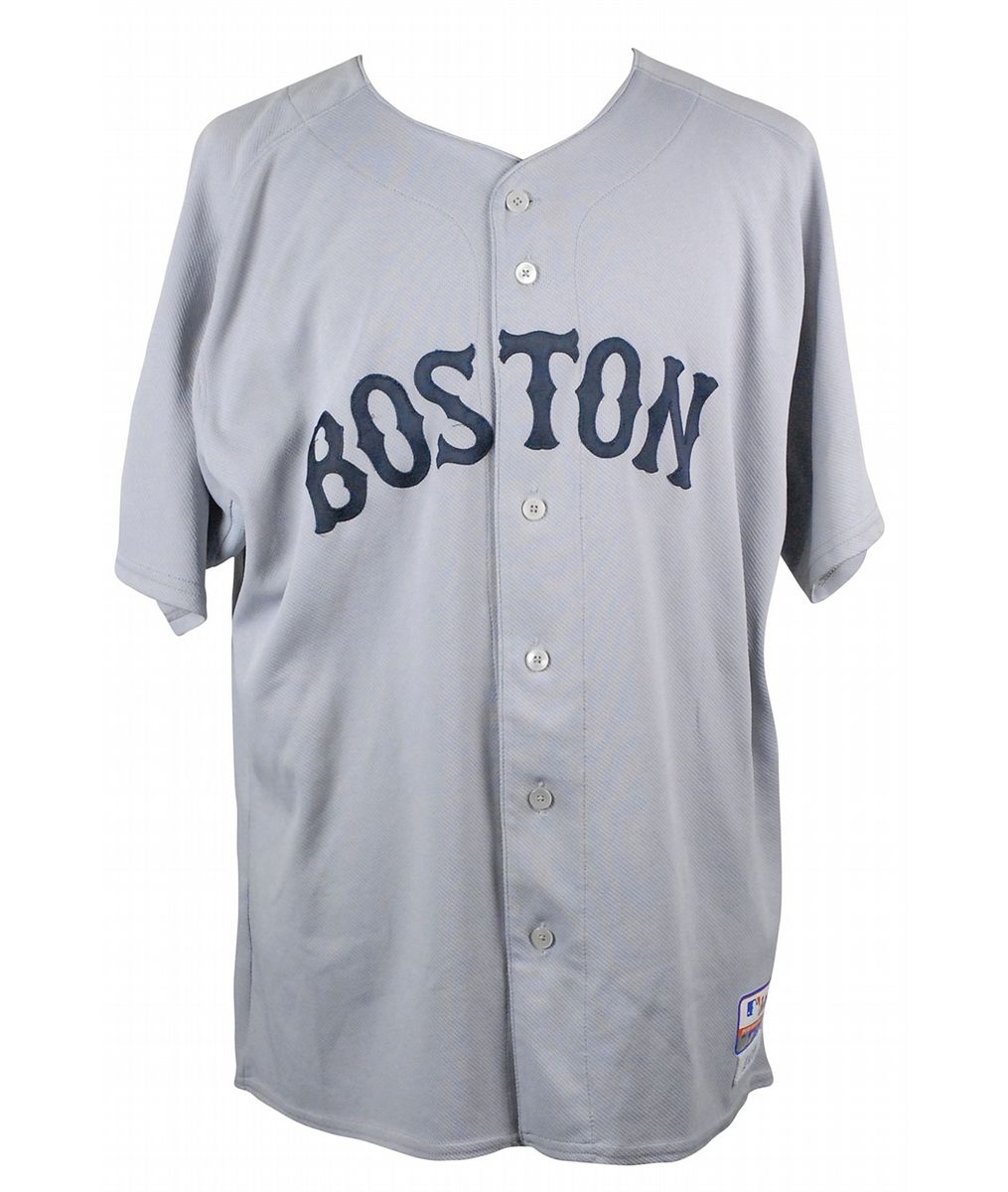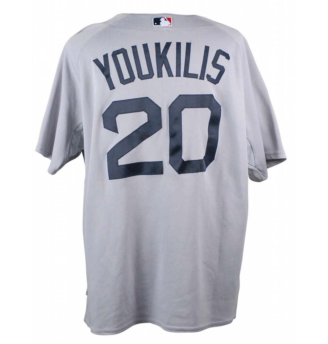 Youkilis’s game-used official gray Majestic ‘cool base’ road jersey from the 2009 season, featuring “Boston” across the chest, “Youkilis” and his number 20 on the back, and a logo patch on the left sleeve. The Majestic manufacturer’s tag is present on the front left tail, with the adjacent tag indicating number, size, and season, “20 50 09.” The jersey exhibits general wear from use. Steiner and MLB authentication labels are affixed to the manufacturer’s tag. Accompanied by a letter of authenticity from Steiner Sports.