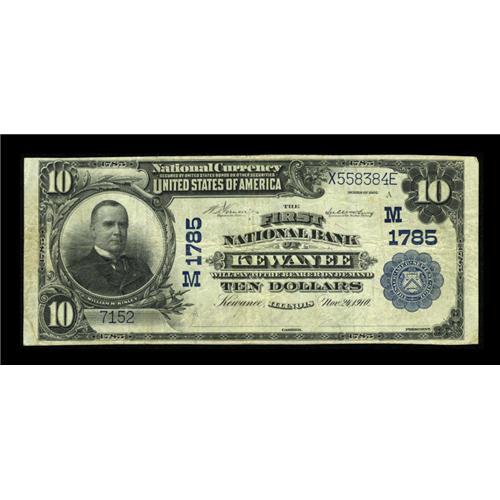 <B>Kewanee, IL</B></I> - $10 1902 Plain Back Fr. 627 <B>The First NB</B></I> Ch. # (M)1785<BR>The paper is bright for the grade while the purple stamped signatures have nearly faded completely away. <B>Fine.</B></I><BR><I>From The Lincoln Collection</B></I><BR><BR><b>Shipping:</b> Coins & Currency (<a target="_blank" href="http://www.heritageauctions.com/common/shipping.php">view shipping information</a>)