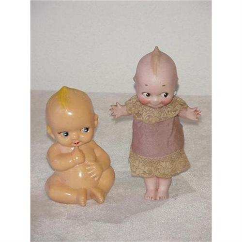 Two kewpie dolls, one is porcelain bisque, the other plastic. The porcelain one is 7 1/4" tall, her arms move and she is wearing a silk dress with lace trim and matching under slip. Her condition is good, there is a small chip to one wing shown. She is a vintage Rose O'neill Kewpie, O'Neill is signed under her feet, there is part of the heart label on the chest. The plastic one is 6" tall and is actually a talcum powder shaker marked on back, J.S.N.Y Hong Kong. Condition is good.