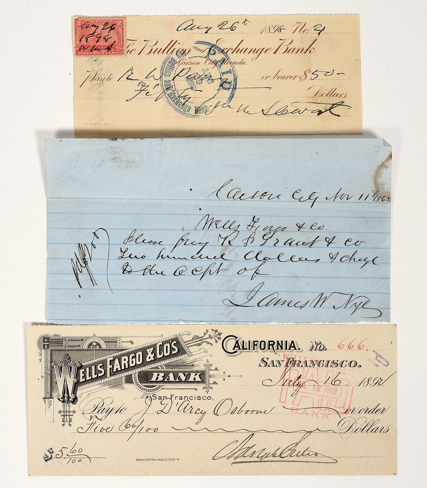 Lot of 3 different. 1)Unusual 1862 handwritten draft, payable at the Wells Fargo Bank in Carson City, signed by Governor James W. Nye. Information on Nye is included. 2) Bullion & Exchange Bank Check, 1898, signed by US Senator William M. Stewart. Detailed history included. 3) Wells Fargo & Co's Bank, San Francisco, signed by Adolph Sutro in 1892 before he became the mayor of San Francisco.