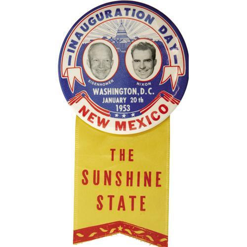 <B>Key Eisenhower & Nixon Jugate Button Rarity.</B></I> 3 1/2" inaugural jugates in this basic design honoring various states were sold by Washington, D.C. vendors for both the 1953 and 1957 Inaugurations. The New Mexico version was unknown until recently, when the first example to appear soared to over $1500 in an internet auction. There has been no "find" of these; the present example comes from the estate of former G.O.P. national chairman Ray Bliss. Choice condition.