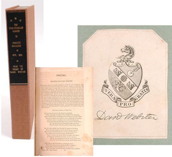 [Key, Francis Scott]. "The Star Spangled Banner" (in Analectic Magazine). Daniel Webster's copy with his engraved bookplate on the pastedown. Analectic Magazine November 1814. "The Star Spangled Banner," published as the poem "The Defence of Fort M'Henry," pp 433-434. Full contemporary fine-grained calf, gilt borders, very neatly rebacked. small marginal repair to portrait of Pike, normal foxing, and a few scattered stains. A very good copy. Housed in a custom-made, reddish-brown cloth case with marbled edges and black label with gilt lettering.