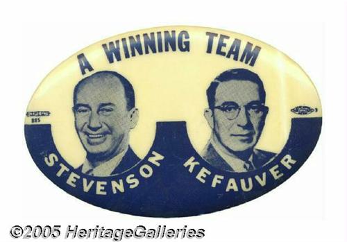 <B>Key Oval 1956 Adlai Stevenson - Estes Kefauver Jugate Button</B></I> With one common exception, jugate buttons for this ticket, which lost badly to Dwight Eisenhower and Richard Nixon, range from scarce to rare. This 2 3/4" wide oval has always been the most sought-after variety. Condition is excellent, although the white has turned, typically, somewhat "creamy" in shade. A minor white vertical line to the right of Kefauver's left ear was probably a result of this part of the button being covered, perhaps by a thin rubber band which protected the color from light, which caused the slight toning. A very nice example, as the photo clearly shows. Lot:264