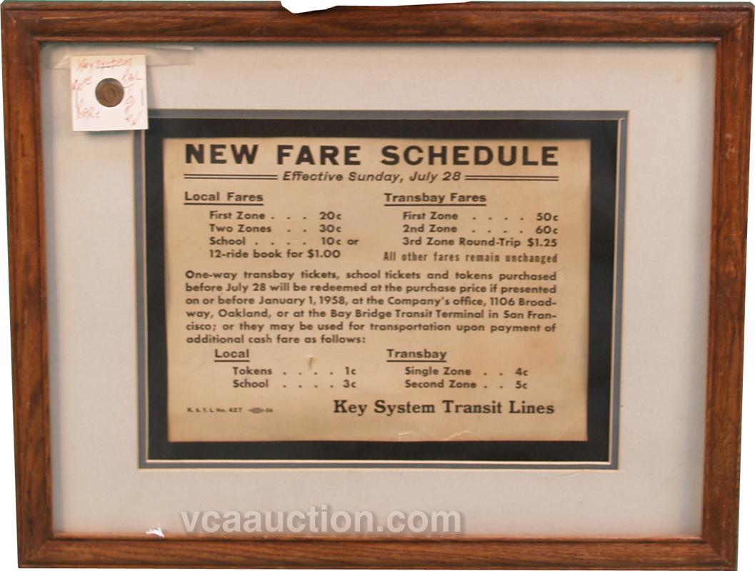 Key System Transit Lines Cardboard Sign New Fare Schedule, framed - 20" x 16" w/ key system rail token.