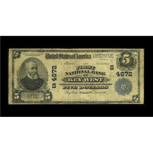 <B>Key West, FL</B></I> - $5 1902 Plain Back Fr. 602 <B>The First NB</B></I> Ch. # (S)4672<BR>This is a much in demand bank from this exotic location. A little bit of scuffing is found on the back and the edges are extremely nice for the grade. <B>Very Good.</B></I><BR><BR><b>Shipping:</b> Coin/Currency (<a target="_blank" href="http://www.heritageauctions.com/common/shipping.php">view shipping information</a>)