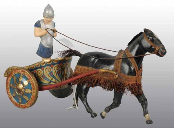 Description Italian. 1922. Fully signed with trademark on bottom. Tin horse with moving legs also jointed at the knees, pulls a tin decorated chariot with a paper-maché gladiator. Some paint wear on tin and key is missing. Condition (Very Good). Size 15" L.