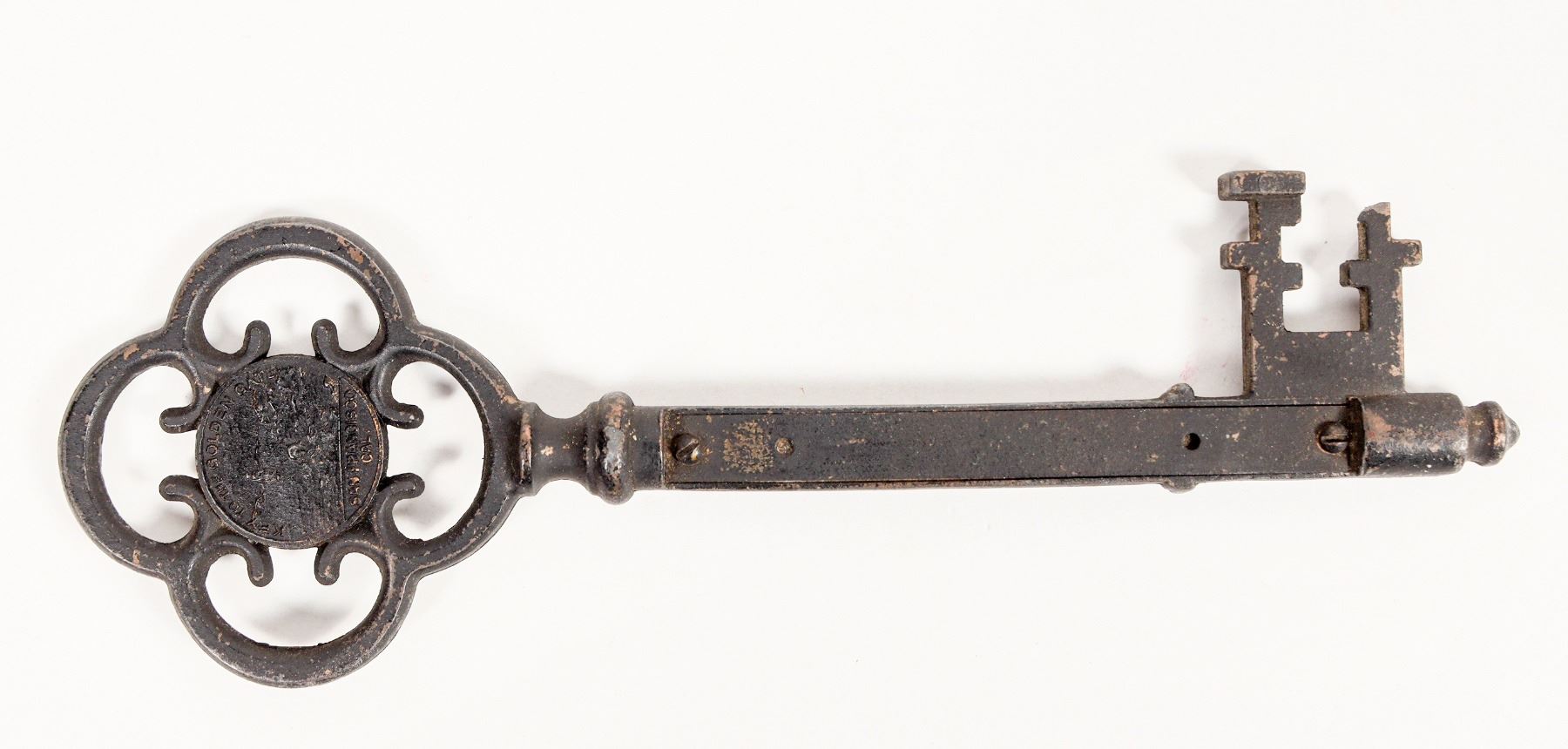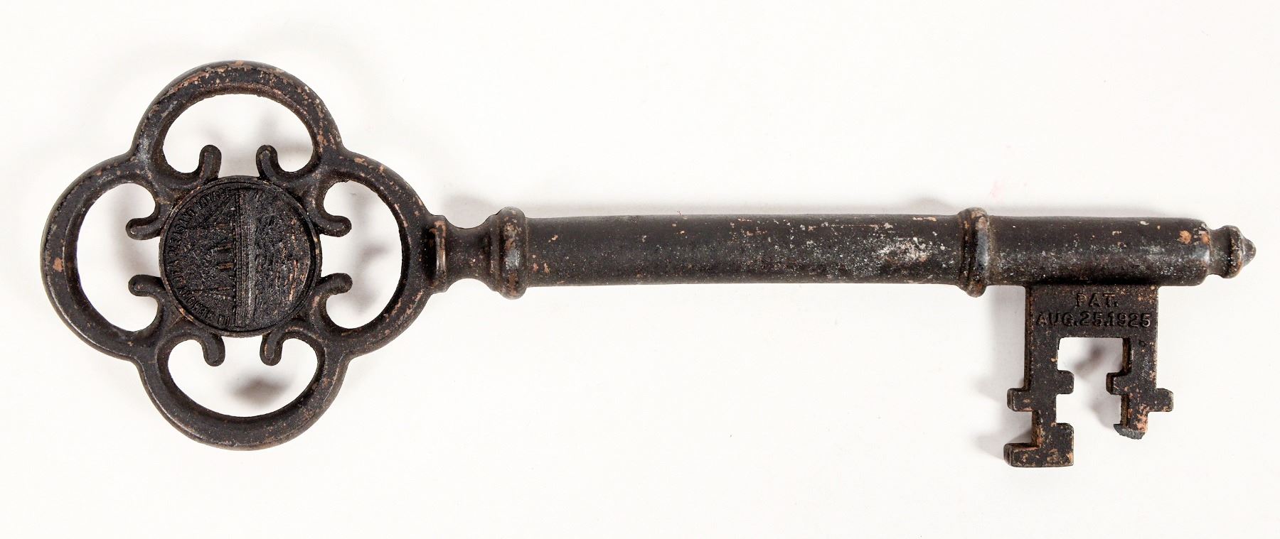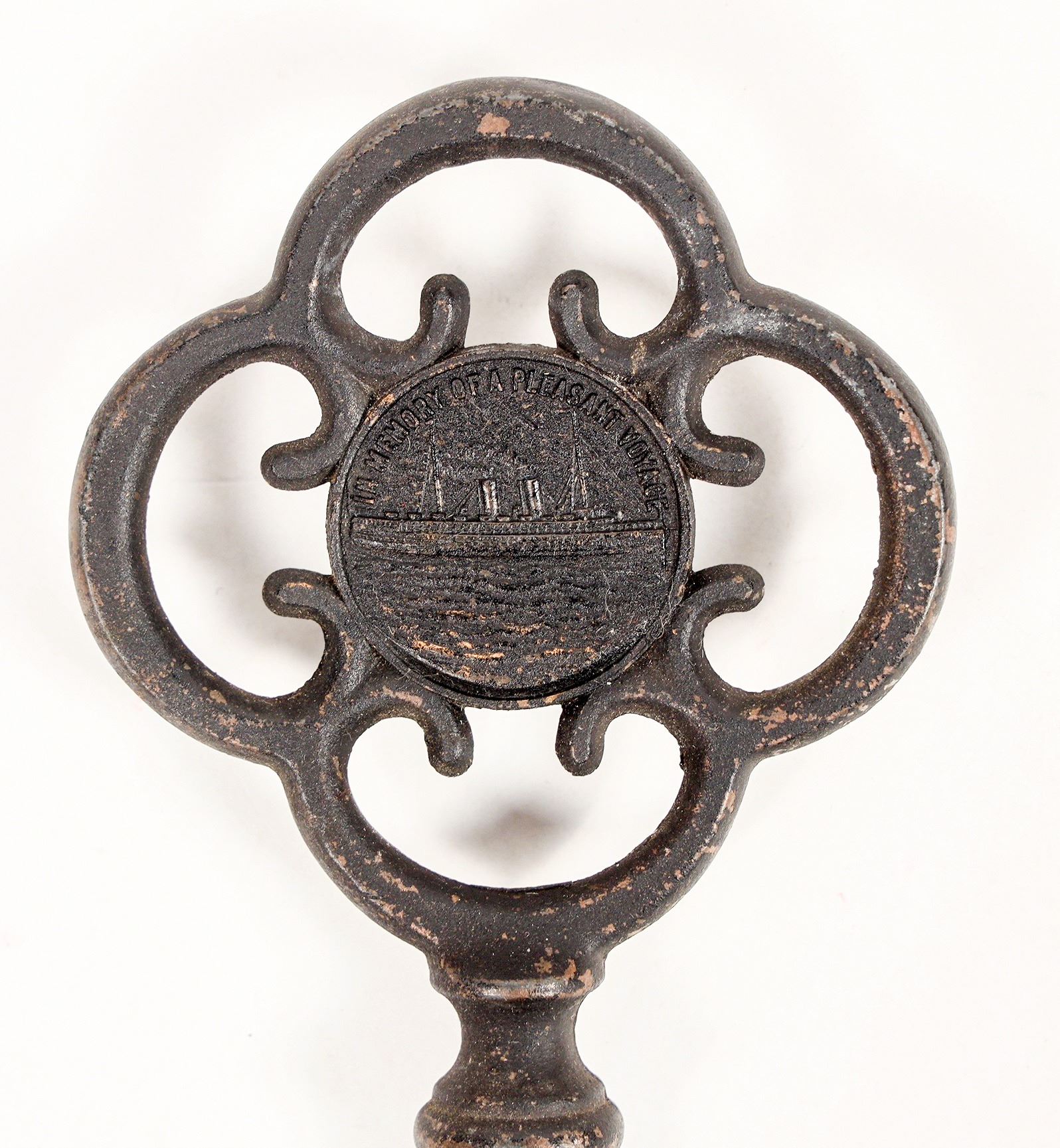 A souvenir in memory of a pleasant voyage. Metal key 8 1/2 inches long, 3 inches wide. One side has "key to the Golden Gate / San Francisco, Cal." the other "in memory of a pleasant voyage," with a steamship. The Gate has no bridge so it's from before 1936.