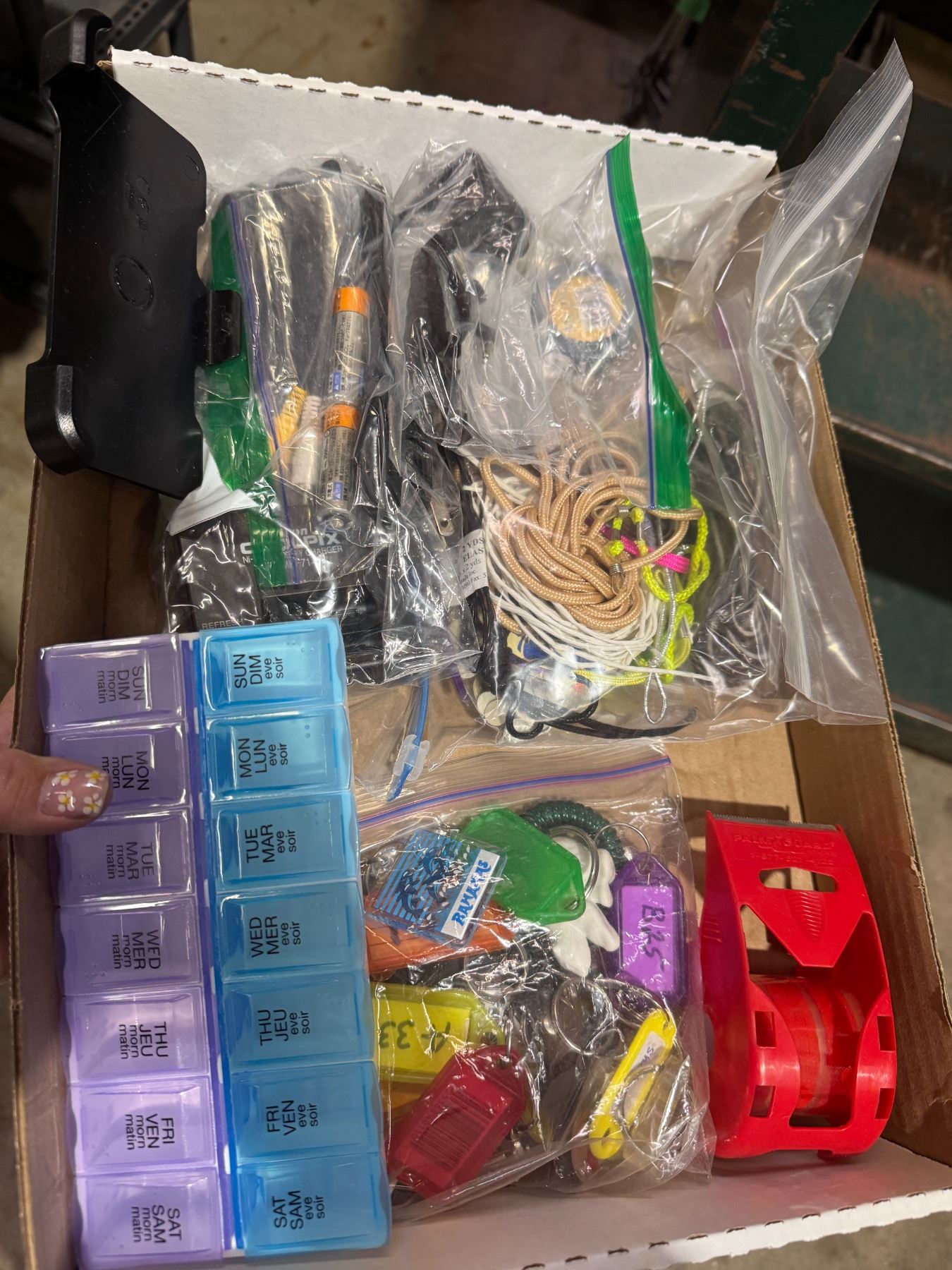 Keychains, tape dispenser, pill container, and other items