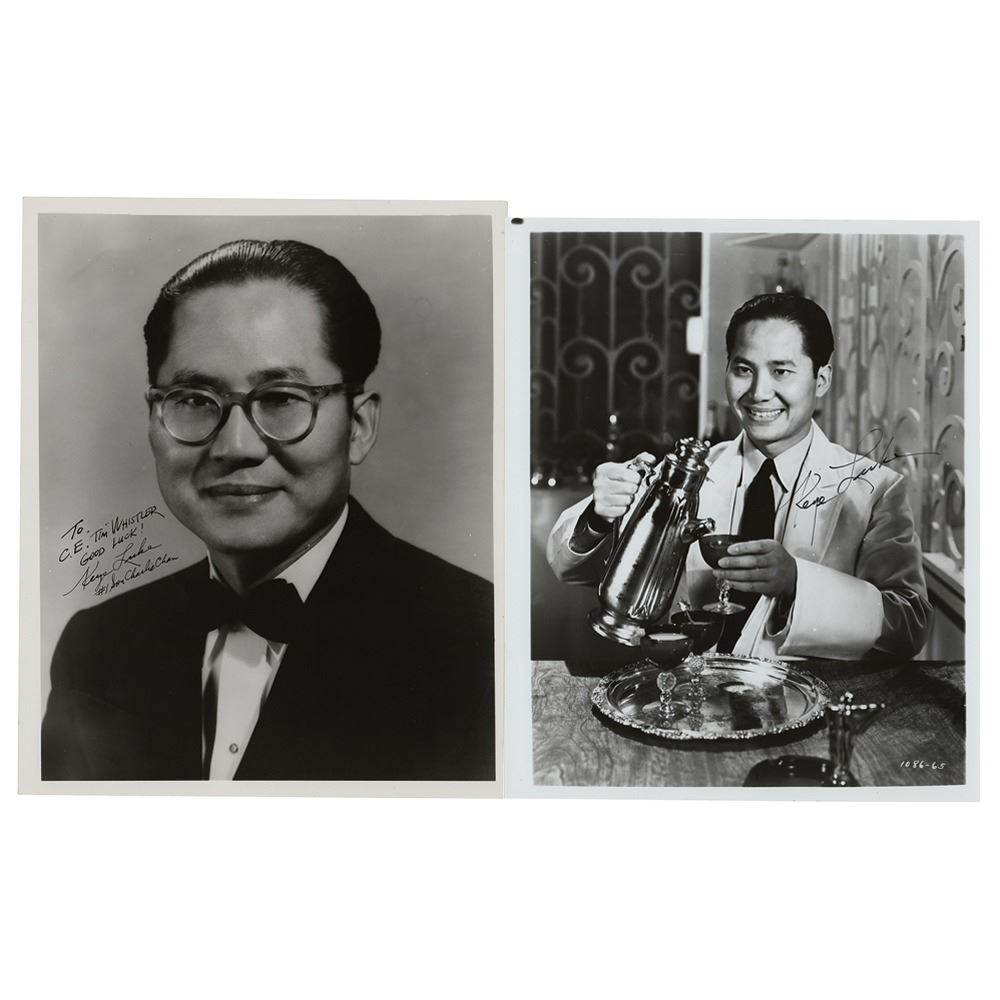 Chinese-born American film and television actor (1904–1991) who was the first Chinese-American contract player signed by RKO, Universal Pictures, and Metro-Goldwyn-Mayer, and was one of the most prominent Asian actors of American cinema in the mid-20th century. A founding member of the Screen Actors Guild, Luke is remembered for playing Lee Chan in the Charlie Chan films, the original Kato in the 1939–1941 Green Hornet film serials, and Mr. Wing in the Gremlins films. Two signed photos: a vintage glossy 8 x 10 head-and-shoulders photo, signed and inscribed in fountain pen, "To C. E. 'Tim' Whistler, Good luck! Keye Luke, #1 Son Charlie Chan"; and a glossy 8 x 10 photo of Luke pouring tea, signed in black felt tip, "Keye Luke.". In very good to fine condition, with surface impressions to the inscribed portrait.