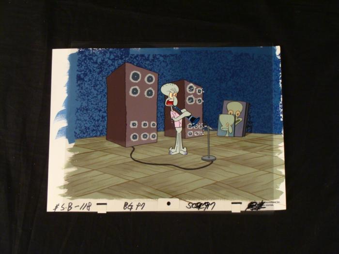 To create production cels, the original animator's drawing is transferred onto an acetate cel (by hand-inking and/or photo copying). The cel is then hand-painted on the reverse side. The background accompanying this set-up is a hand-painted original production background. * A key master background setup, is a cel or cels with the background from the same scene that were originally photographed. When framed these will look exactly as they do in the original film or cartoon short.The background and cel are ready to be matted and framed. It is a colored background with a cel and has the animator's notations at the bottom of both. The cel has multi-layers; first are bubbles, then is Squidward, next are the speakers, and finally the microphohe. There is some paint residue on the third cel.