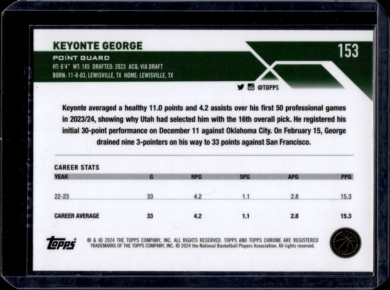 Keyonte George Green Topps Refractor RC 2023-24 Topps Chrome #153