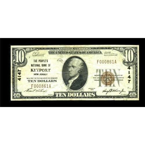 <B>Keyport, NJ</B></I> - $10 1929 Ty. 1 <B>The Peoples NB</B></I> Ch. # 4147<BR> A very scarce Monmouth County bank with only two large and nine small notes reported from here. This example is high grade but has a small repair in the bottom margin. <B>Very Fine</B></I> in appearance, but with the aforementioned repair. <BR><I>From The John Ameen Collection</B></I><BR><BR><b>Shipping:</b> Coins & Currency (<a target="_blank" href="http://www.heritageauctions.com/common/shipping.php">view shipping information</a>)