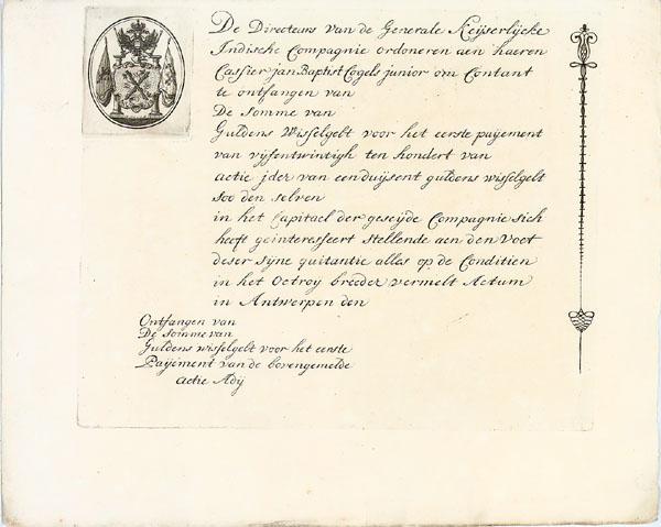 1723, Antwerp. First Installment payment for stock. Black. At left vignette of Code of Arms of the company. Charles VI of Austria West Indies as well as the African Coast authorized the Imperial India Company. Commodities traded included spices, gold silver and silk. At the time the stock was issued in 1723, the issue was oversubscribed in a matter of hours. Investors were not paid very high dividends from the very first, frequently over 30% per year successful that war was threatened by numerous competitor nations partly in order to smooth the way for the accession to the throne of his Charles ordered the company to cease operations and begin liquidation, a year. A fine early piece from this important trading company. Uncancelled and Extremely Fine.