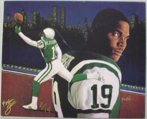Keyshawn Johnson hand autographed New York Jets Stretched Canvas 16x20. Limited Edition 2 of 19. large scratch across center of canvas as shown, is sold as is, no returns. Certificate of Authenticity from Athlon Sports with photo from signing.