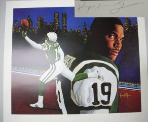 The New York Jets drafted Johnson with the top overall selection in the 1996 NFL Draft. He was the first wide receiver selected with the number one overall pick since Irving Fryar was chosen by New England in 1984. While in New York, he played three seasons (1997–1999) under Bill Parcells, who in two seasons would turnaround the Jets from 1–15 in 1996, Johnson's rookie year to 9–7 in 1997 & 12–4 in 1998 & the franchises first ever AFC East Division title. Keyshawn Johnson has hand autographed this New York Jets 20x24 Oversize Lithograph. Hand autographed in pencil in bottom center of lithograph. Close up of signature shown in upper right corner. Certificate of Authenticity from Worldwide Entertainment and Sports. Regular Price $199.00