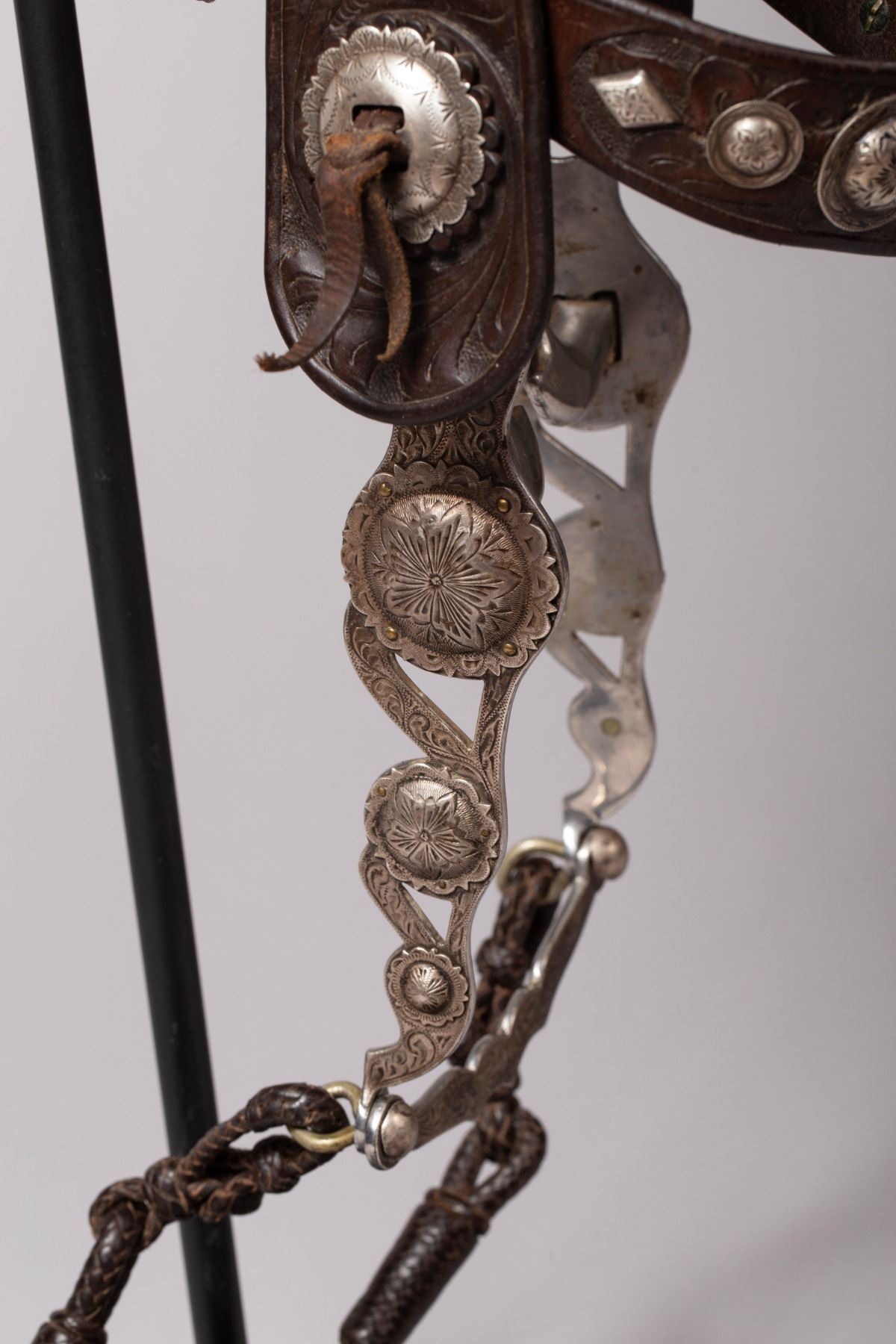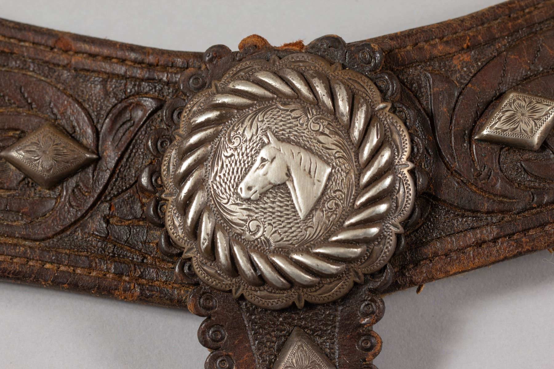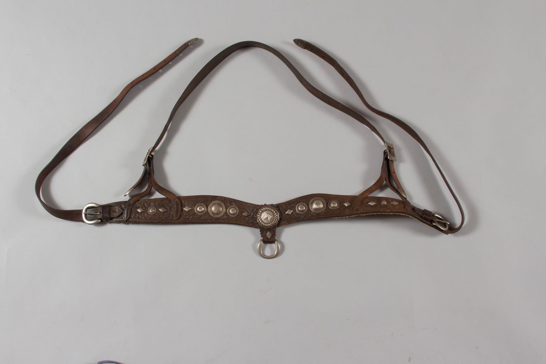 Rare Brown Keyston Bridle and matching Breast Collar. Bridle is adorn with 24 sterling silver pieces. Nicely tooled with sterling silver conchos, face drop and decorated cheeks, brow and nose bands. Breast Collar is finely tooled with 15 sterling silver pieces plus the iconic Keyston horsehead concho. All buckles are marked "Keyston".