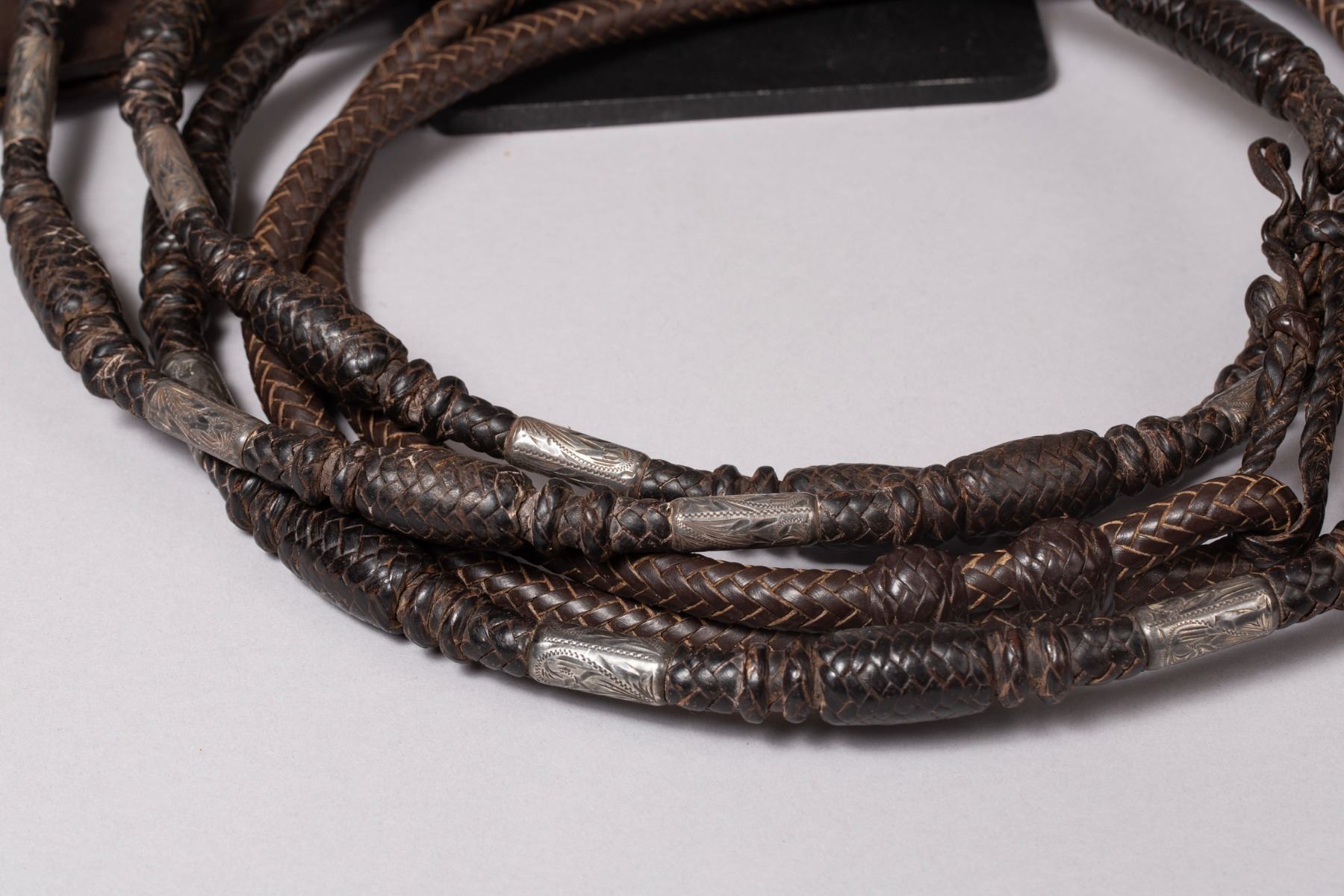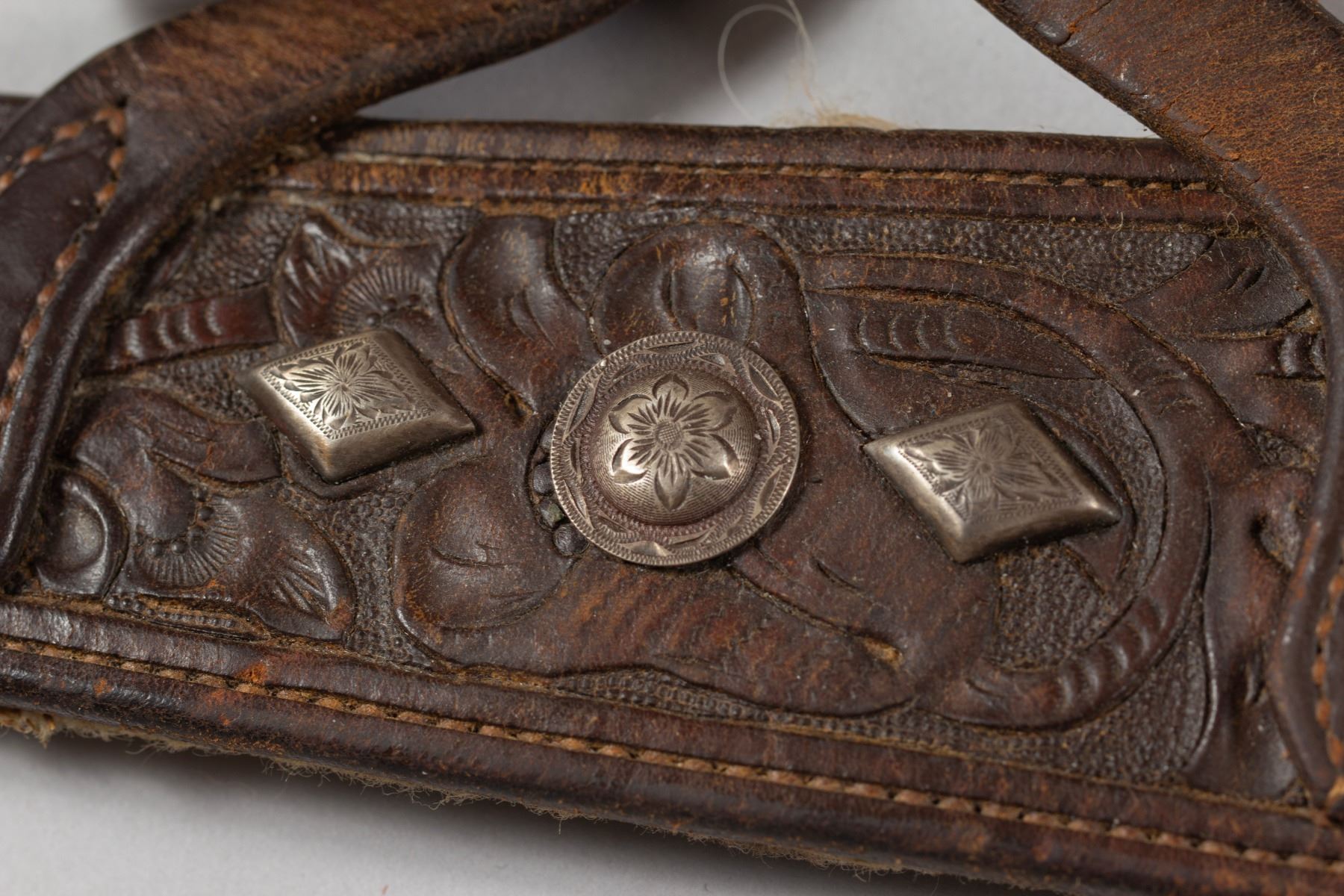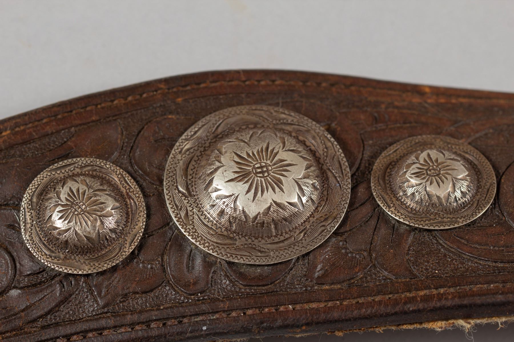 Rare Brown Keyston Bridle and matching Breast Collar. Bridle is adorn with 24 sterling silver pieces. Nicely tooled with sterling silver conchos, face drop and decorated cheeks, brow and nose bands. Breast Collar is finely tooled with 15 sterling silver pieces plus the iconic Keyston horsehead concho. All buckles are marked "Keyston".