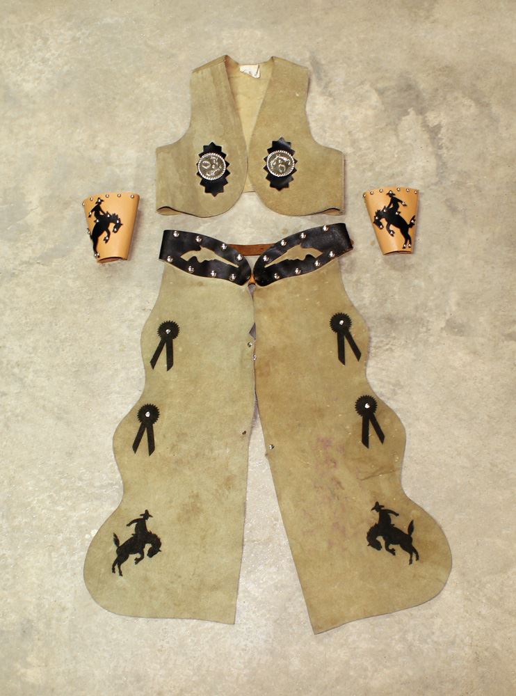 Very collectable Keyston Bro's 3 piece set including batwing chaps, leather vest and bucking horse cuffs, in nearly unworn condition.