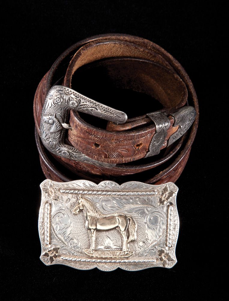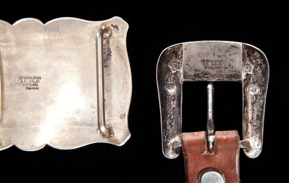 a) Early Sterling Trophy Buckle with standing horse in 1/10 14K gold and patent applied for keeper, 2 3/8” x 3 5/8” with high relief and fine detail. As new condition; b) 1”- 3 piece sterling set with horsehead decoration on buckle and scalloped keeper. On early tooled belt, circa 1930s.