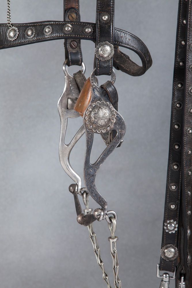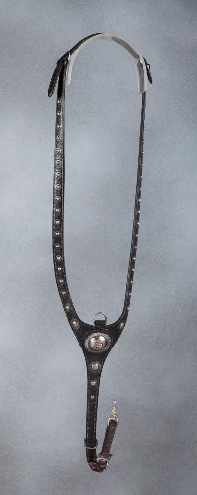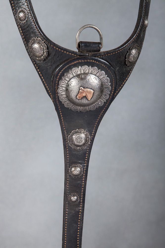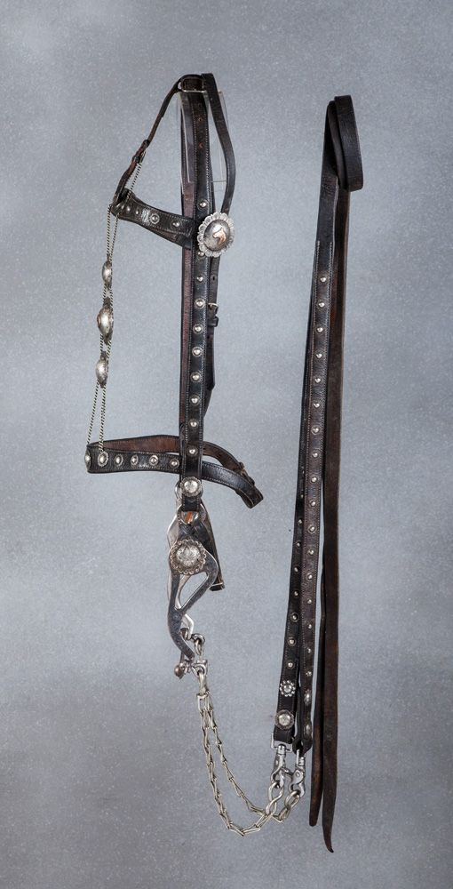 Keyston Bros Silver Mounted Headstall and Martingale. Keyston Bros, San Francisco, silver mounted California bridle with scalloped and engraved sterling conchos on the brow and nose bands, cheeks and flat reins. Larger conchos at the browbands feature gold horseheads as does the 3-concho face drop which is maker-marked with the Keyston Bros stamp. The headstall is affixed to a Garcia (Reno) stamped silver overlaid bit. Matching Martingale with sterling conchos mounted in graduated sizes. Circa 1950s. Very good condition.