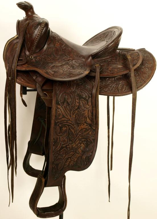 nicely floral carved, 13 1/2" seat, 4" cantle. Saddle very good original condition including sheep skin liner.